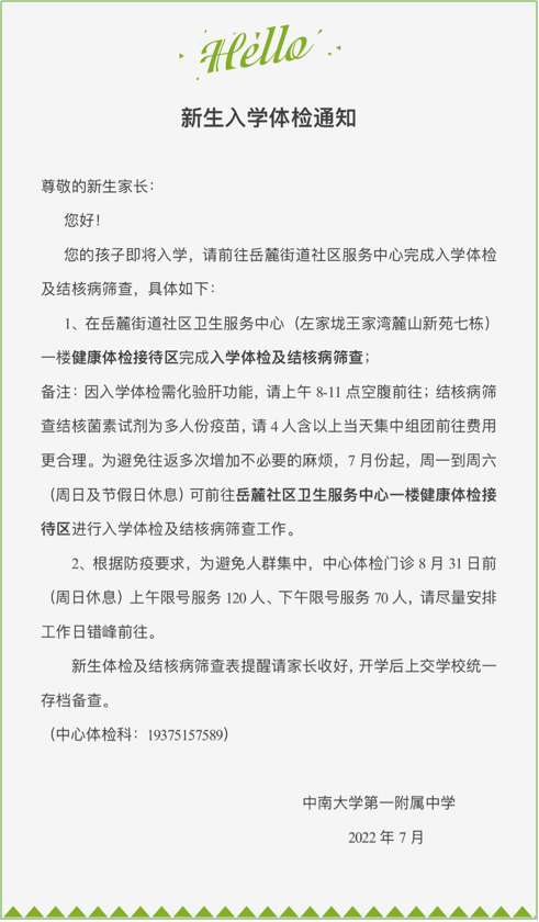 祝贺你被我校录取,成为中南大学第一附属中学2022级大家庭的新成员。为帮助你顺利完成报到手续,特提供以下指引,请仔细阅读并做好相关准备。