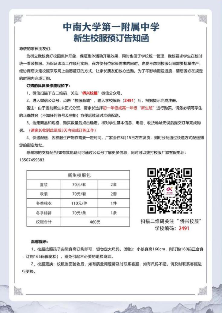 学生在校要求每天穿着校服。请认真阅读《中南大学第一附属中学校服订购告知函》,提前网购校服,8月20日新生军训期间均要求穿好夏季校服(随身携带1-2套换洗的校服)。